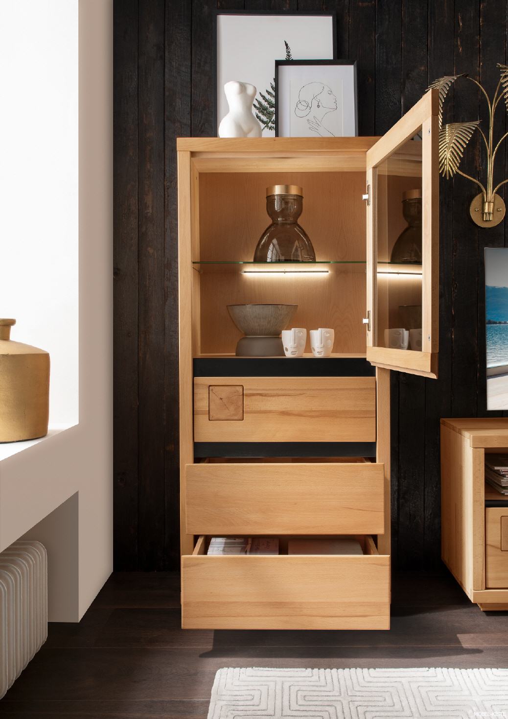 Bei der Ausführung Kernbuche geölt: Außenseiten und Korpus parkettverleimt, Fronten durchgehende Lamellen